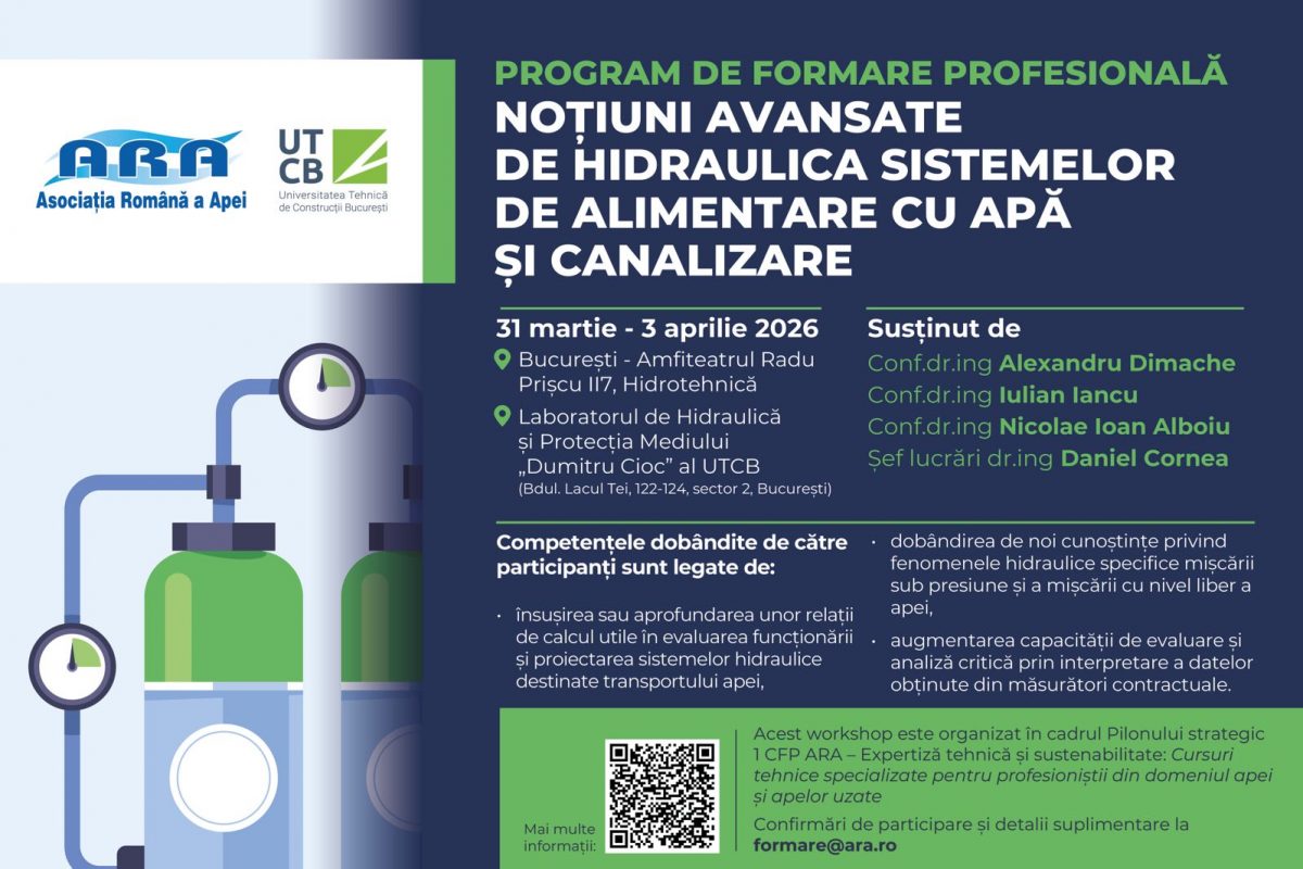 06 Feb 2026 Noțiuni avansate de hidraulica sistemelor de alimentare cu apă și canalizare, 31 martie – 03 aprilie 2026 Mai mult